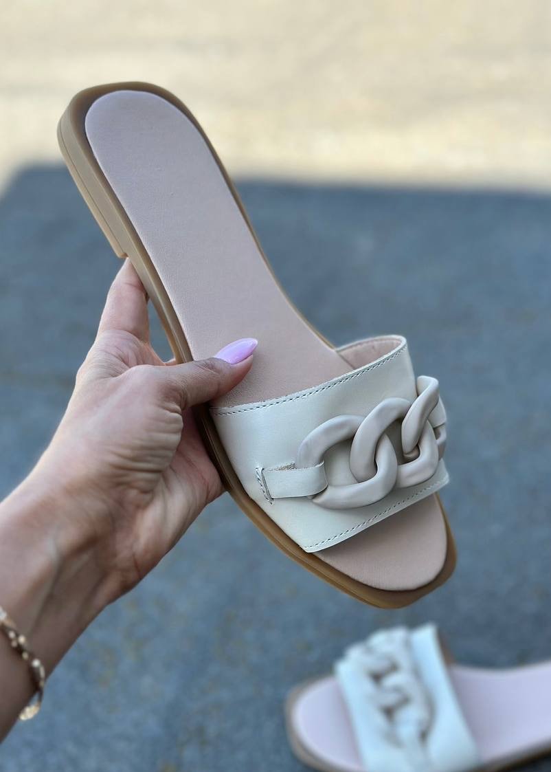 Стильні шльопанці, з натуральної шкіри. Ланцюжок додає їм особливого шарму.